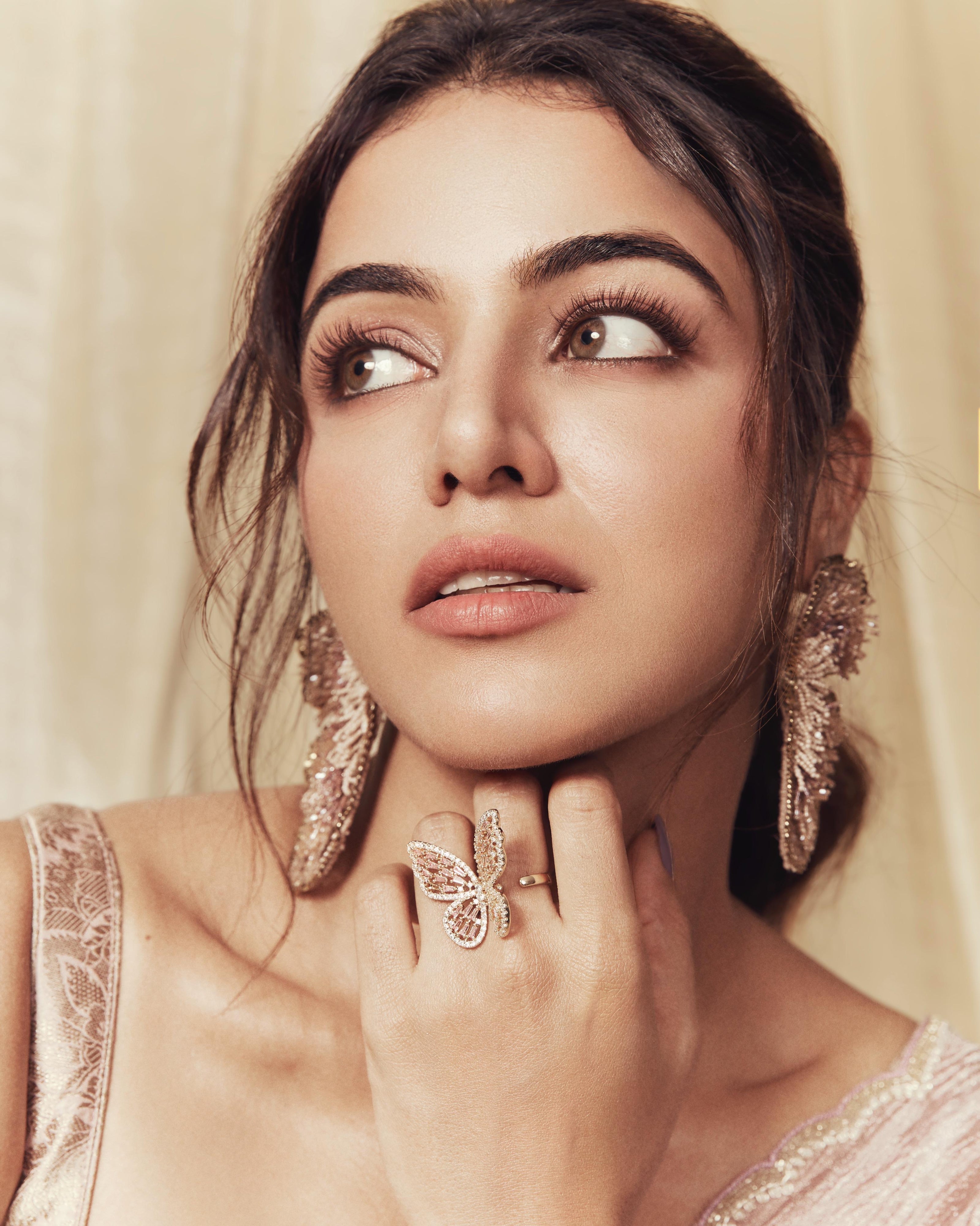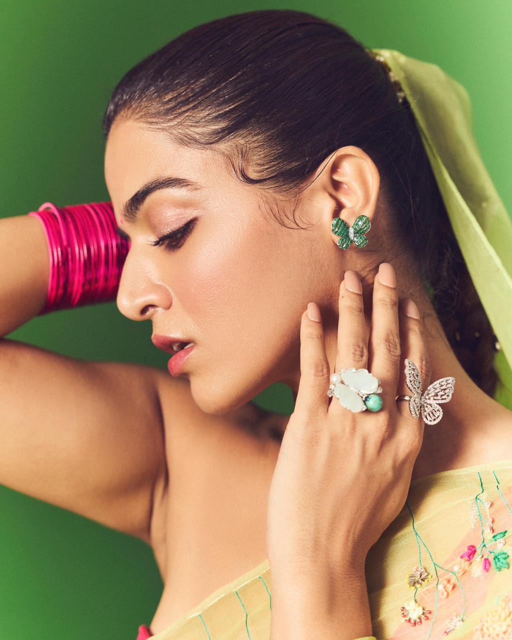 VIEWin Catriona Maang Tika, Eleonora Earrings, Shaylah Necklace, Butterfly Hair Clips, Shaylah Hand Harness & Nail Rings.