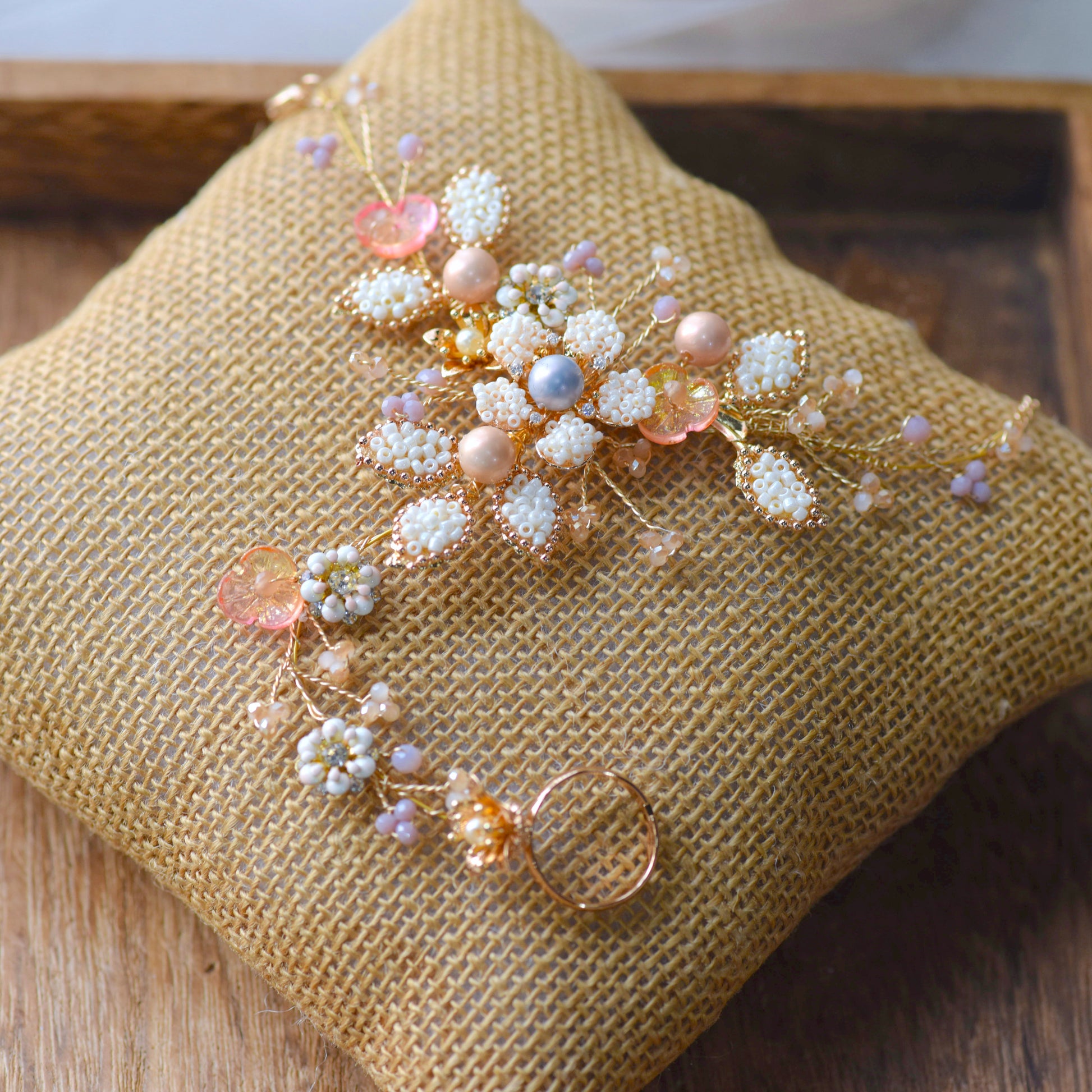 A hand harness which works well for both day or night. Be it a brunch or a night out, Arabella just blends in complimenting you. Keeping our theme alive, this pair features them flowers and leaves but made with a different technique.