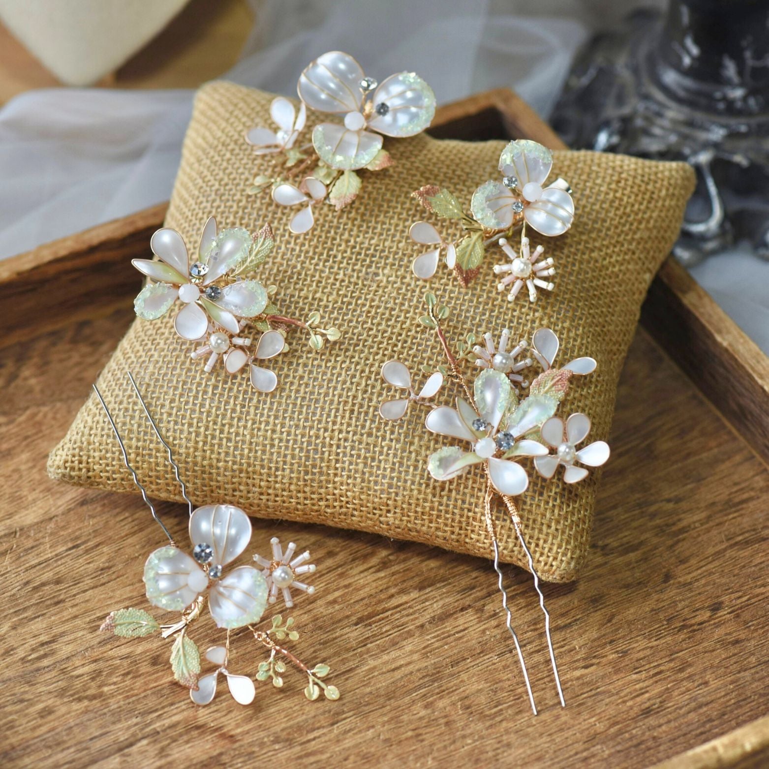 Astraea set of hair clips are handcrafted to add a touch of charm to your locks. Each clip features delicate blooms in white hues, arranged to create an adorable accessory that effortlessly enhances your look. Adorn your tresses with these enchanting floral hair clips.