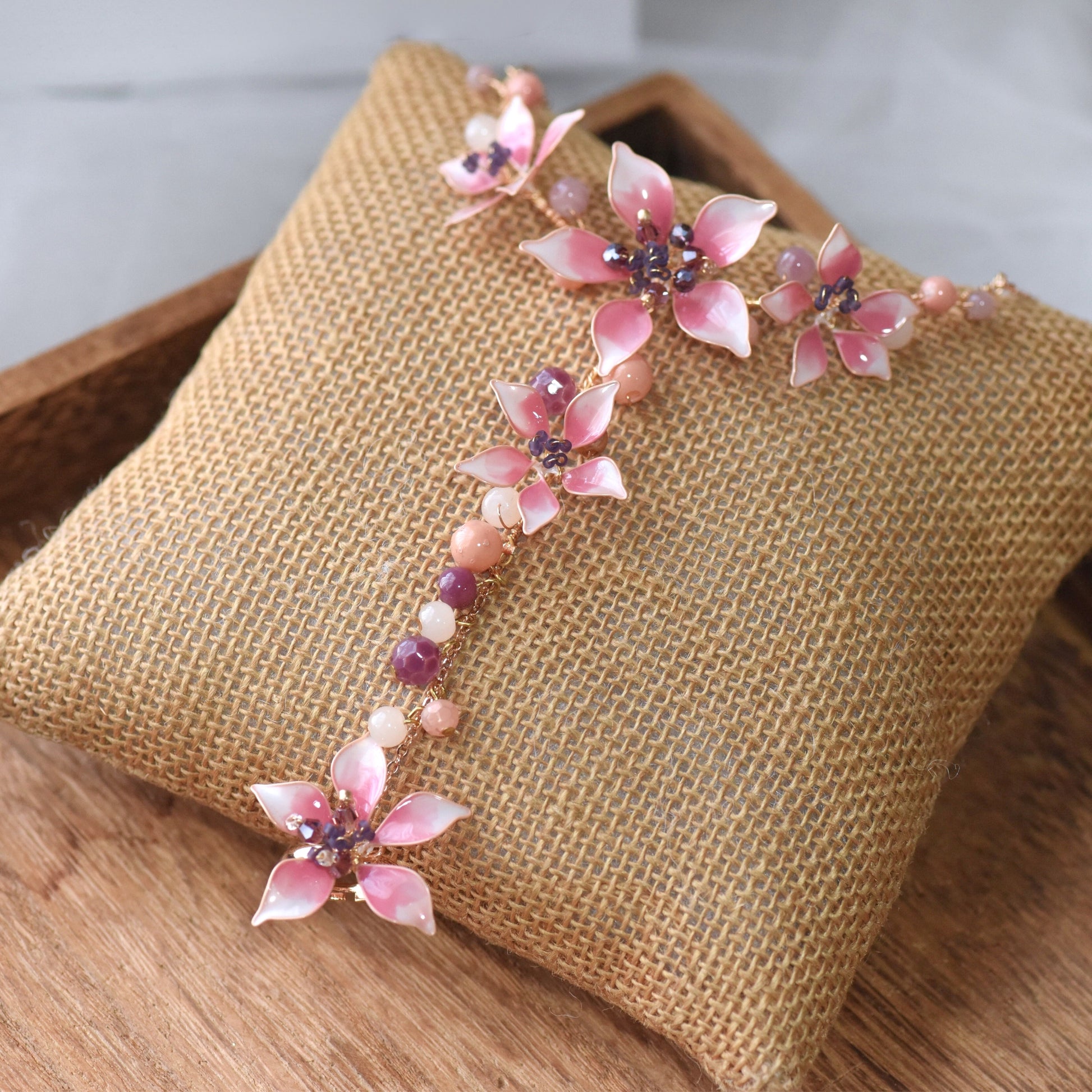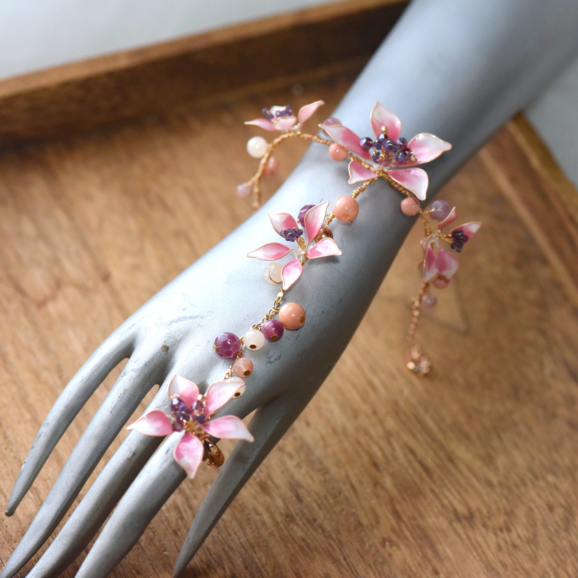 Delicate yet captivating, the Aurelia Hand Harness is inspired by soft florals in full bloom. Handcrafted blush-pink petals with a gentle translucent finish are arranged along a dainty chain, interspersed with pastel beads and deep plum accents that add depth and contrast.