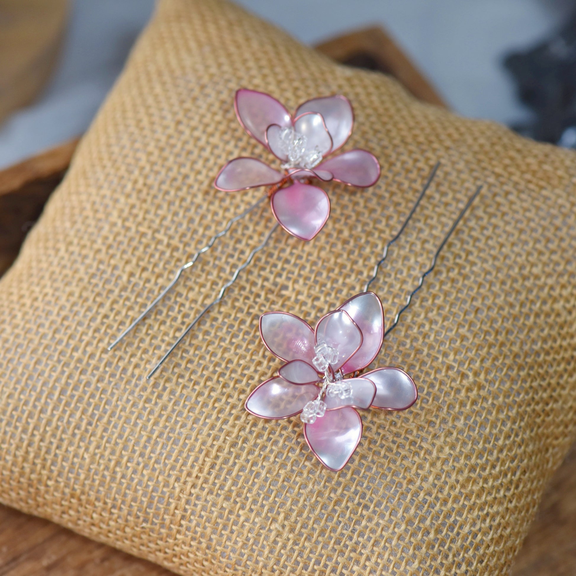 Delicate, feminine and effortlessly elegant — the Ava Hair Clips are inspired by soft blush florals in full bloom. Handcrafted floral petals in luminous pink tones are layered with a pearlescent sheen and finished with crystal accents at the centre, creating a look that feels dreamy yet refined.