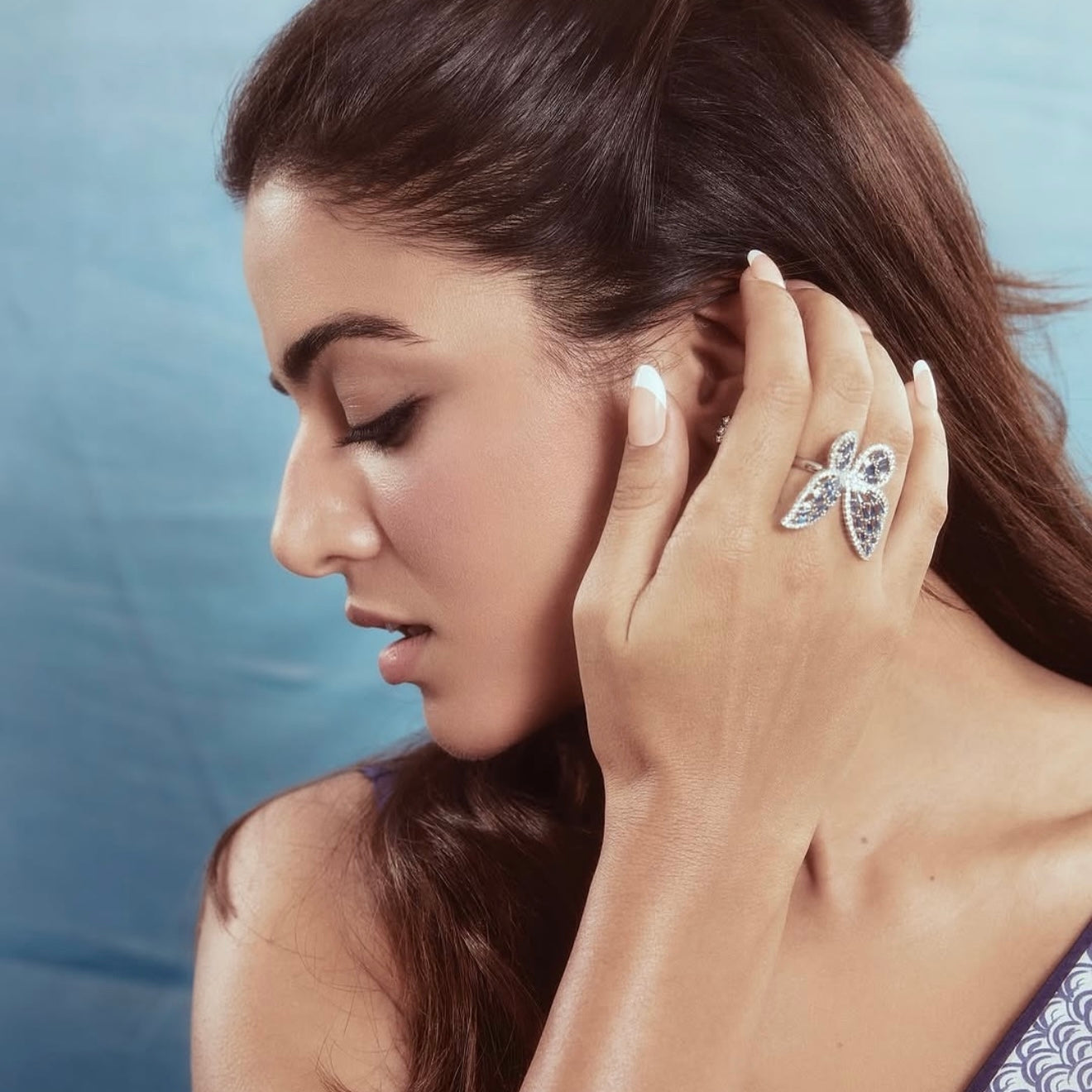 A sparkly ring with sleek elongated crystals. Its elegant design of a butterfly makes it a favourite amongst all. We introduced this stunning ring on Instagram years ago and it has since been one of our bestsellers. This one has been worn by countless brides on their big day! The butterfly ring captures the grace and lightness of a flutter in spring.