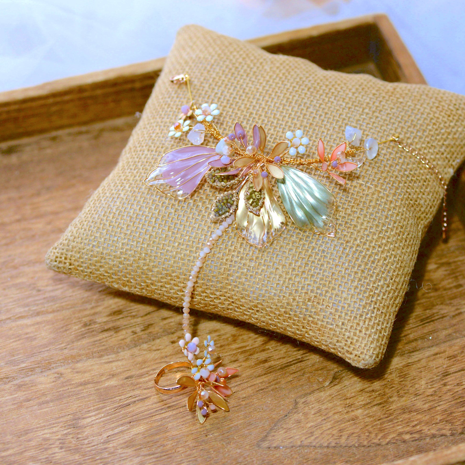 The Catriona Hand Harness is a celebration of bold femininity and intricate artistry. Handcrafted with resin petals in pink, lavender, apricot, and mint green, this statement piece drapes gracefully across the wrist, connecting to a floral ring with delicate beaded strands. Golden leaves and dainty floral accents add depth, while the pastel colour palette evokes the beauty of a flourishing garden at sunset.