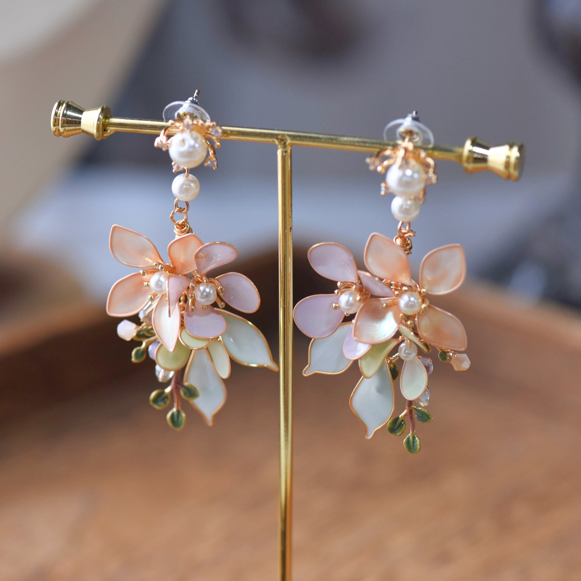 Whisper-soft pastels meet delicate craftsmanship in the Elowen Earrings — a symphony of blush, ivory, and mint petals kissed with gold. Each handcrafted bloom features layered resin petals, lustrous pearls, and sparkling accents that capture the light with every movement.