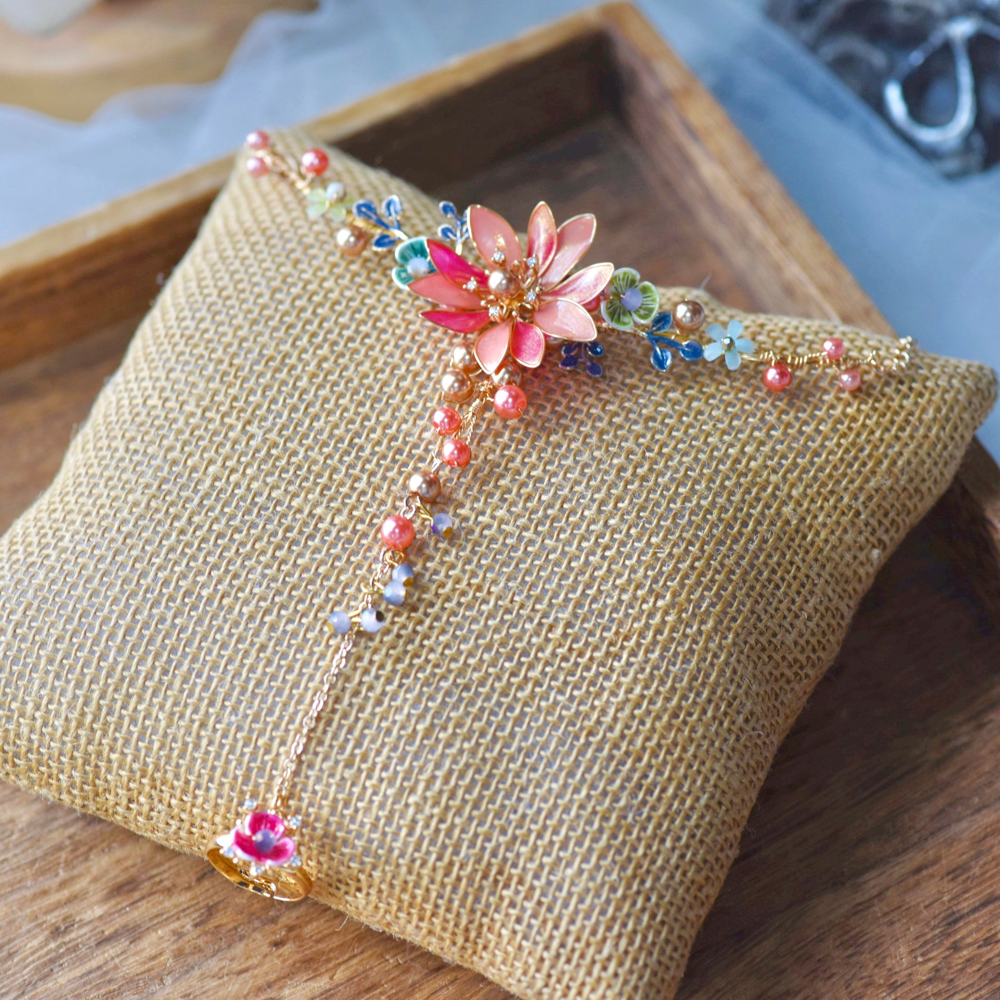 This stunning hand harness is crafted from high-quality resin in pink shades with a touch of blue. The glimmering finish catches the light just right, making this a great choice for a special occasions. The gold wires weave the hand harness in place and add a touch of sophistication.