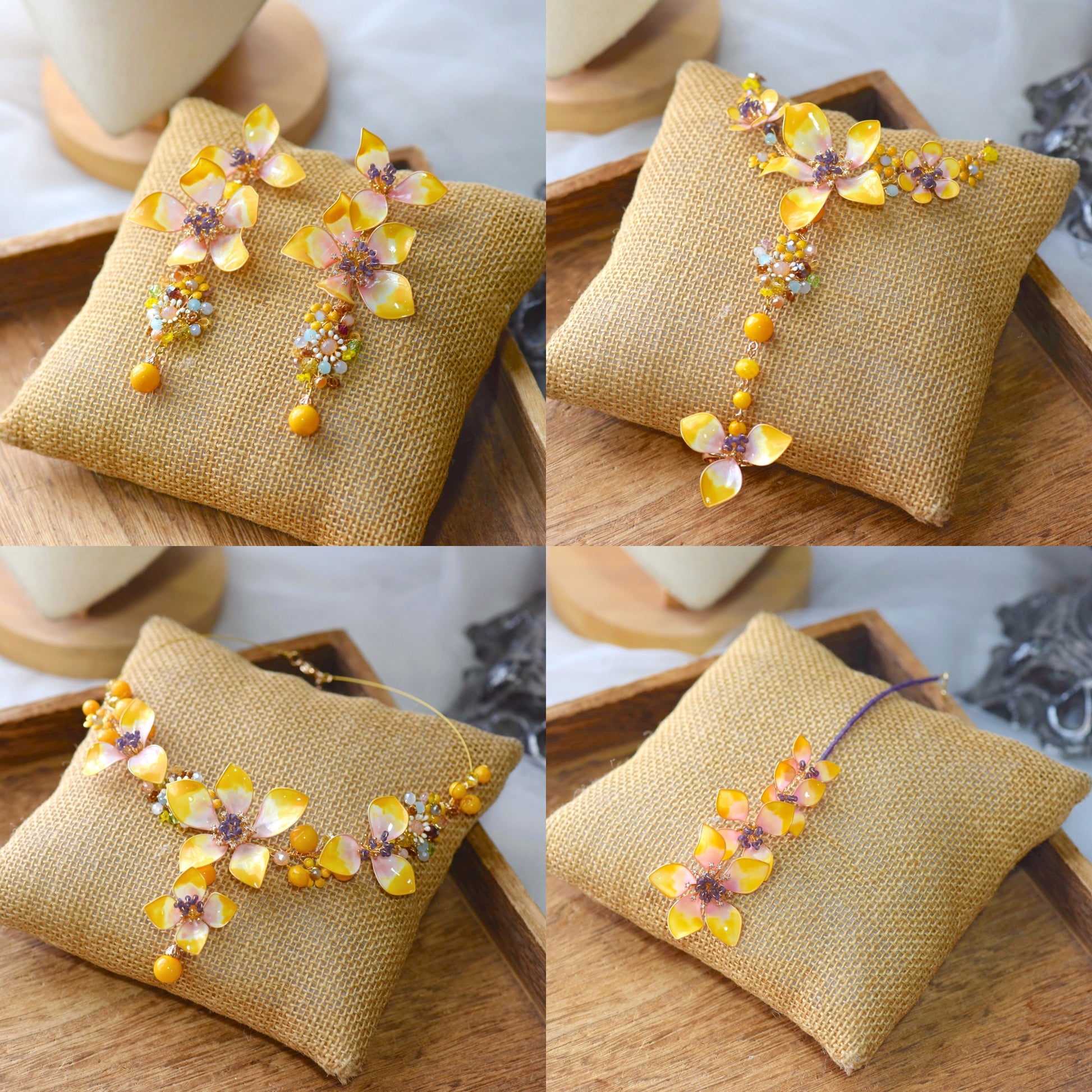 Radiant, festive, and handcrafted to dazzle — the Seraphina Jewellery Set is a celebration of florals in full bloom. Featuring sunshine-yellow and peach-toned petals, lavender bead detailing, and multicolor embellishments, this coordinated set includes statement earrings, a floral necklace, and an elegant hand harness. Whether you're dressing for a haldi celebration, destination wedding, or a modern festive affair, Seraphina brings joy, color, and artisanal charm to every look.