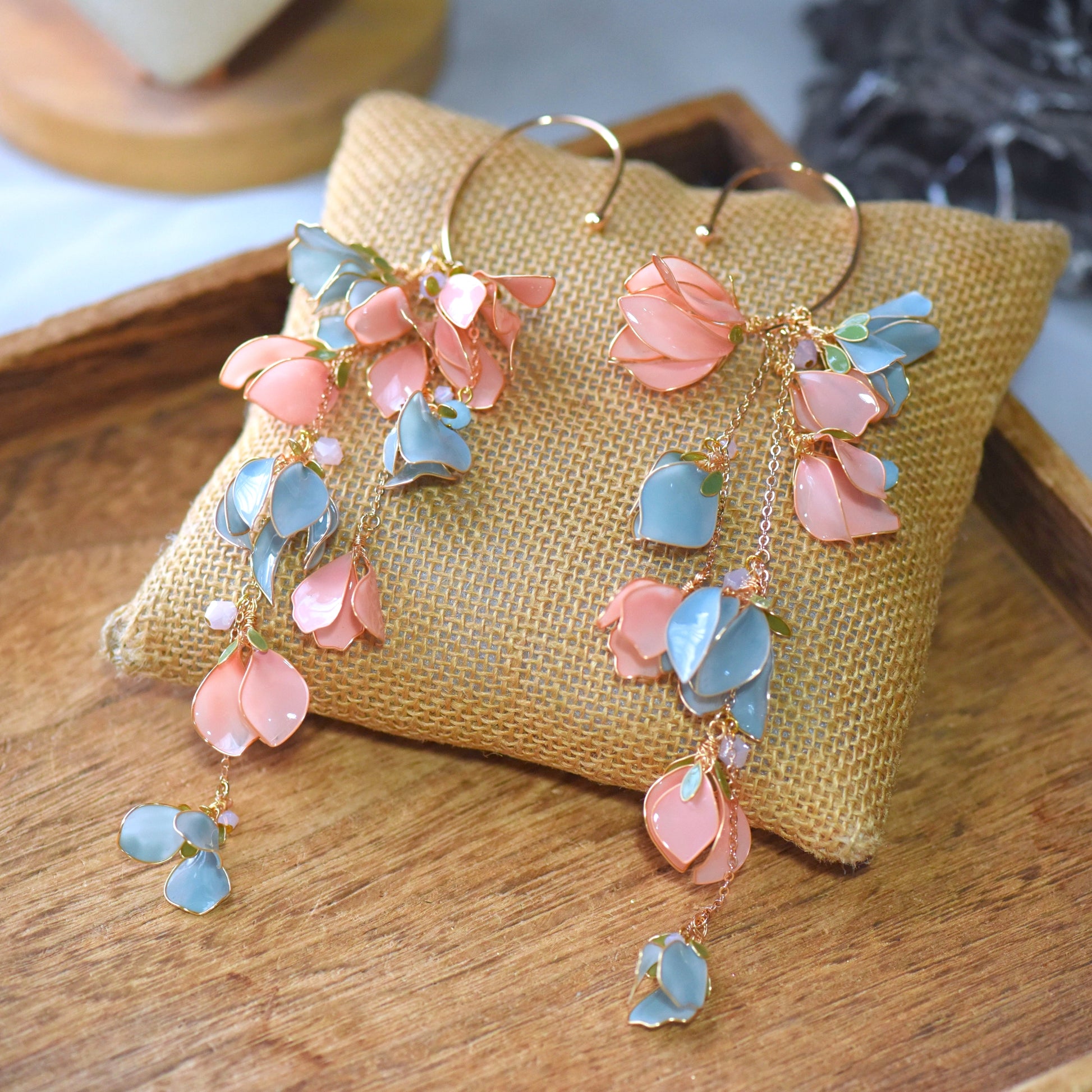 Hand-shaped resin petals in dreamy peach sorbet and frosted sky blue sway gently with every step, catching the light with a soft, enchanting glow. Lightweight yet dramatic, this ear cuff is your go-to statement piece for Mehendi, Haldi, destination weddings and modern festive looks.